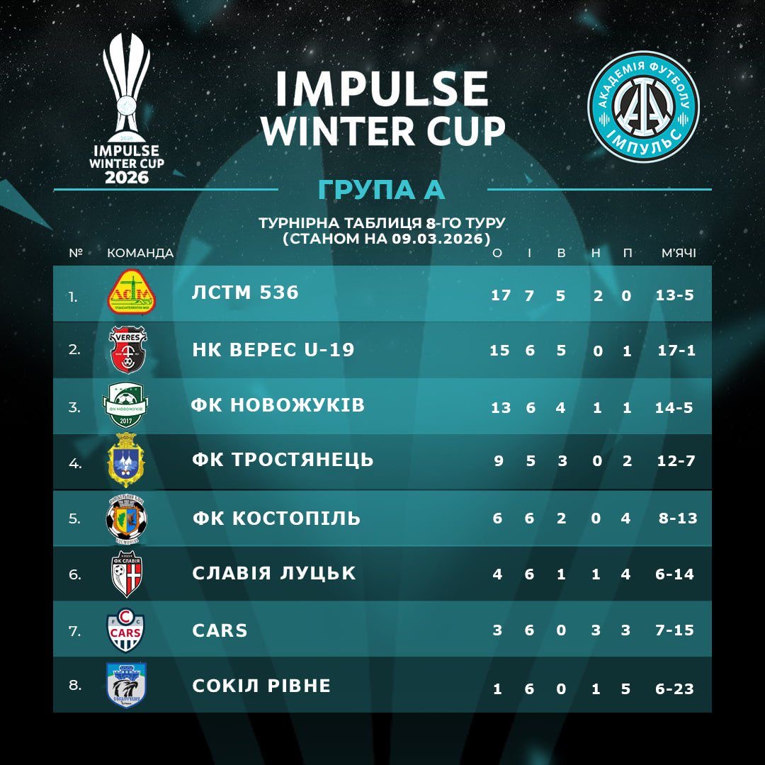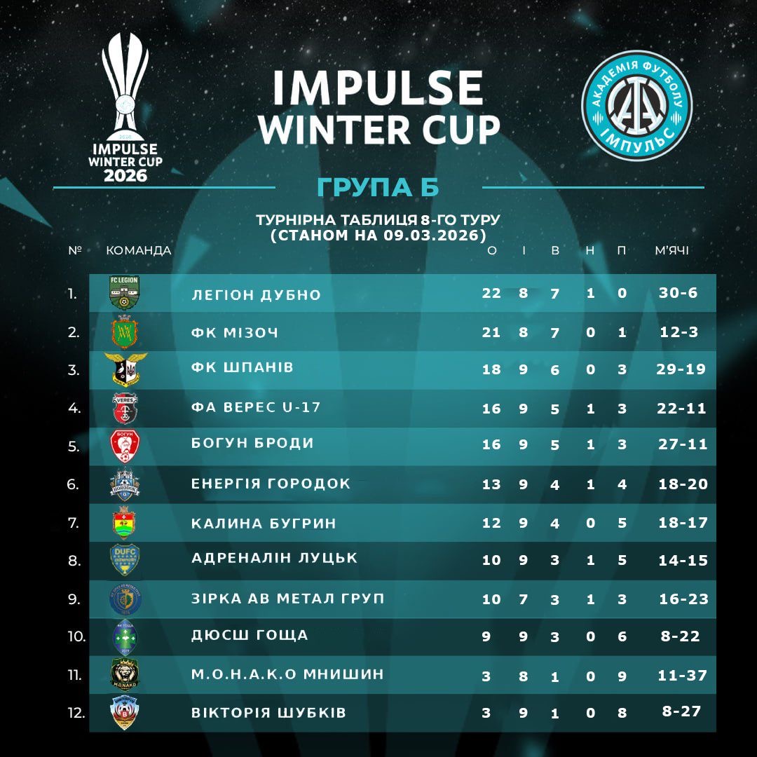 На вихідних, у суботу та неділю 14 та 15 березня, відбудуться матчі 9 туру передсезонного зимового турніру IMPULSE WINTER CUP 2026 Меморіал пам’яті видатних футболістів Рівненщини.